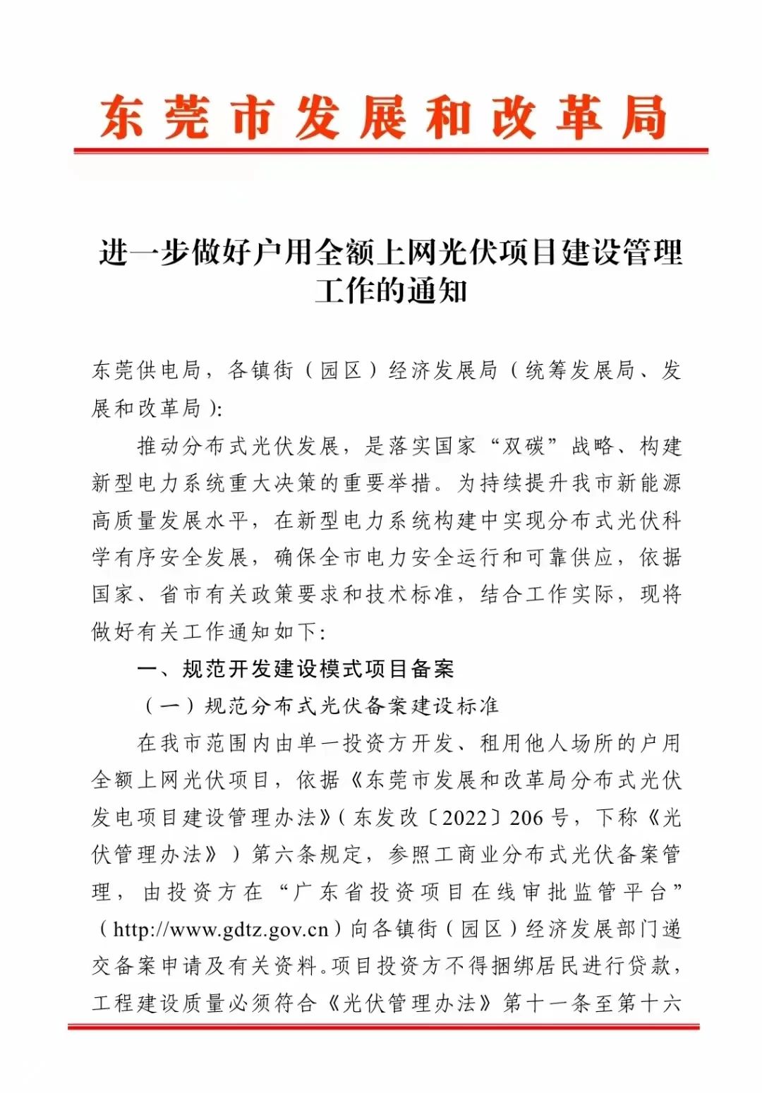 近日,東莞市發(fā)展和改革局下發(fā)了關于《進一步做好戶用全額上網光伏項日建設管理工作的通知》