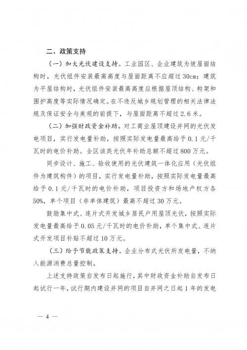 政策方面,文件指出,對(duì)工商業(yè)屋頂建設(shè)并網(wǎng)的光伏發(fā)電項(xiàng)目,實(shí)行發(fā)電量補(bǔ)助,按照實(shí)際發(fā)電量最高給予0.1元/千瓦時(shí)的電價(jià)補(bǔ)助。全區(qū)該類光伏年補(bǔ)助總額不超過800萬元。同步設(shè)計(jì)、施工、驗(yàn)收使用的光伏建筑一體化應(yīng)用(光伏組件為建筑構(gòu)件)的項(xiàng)目,實(shí)行發(fā)電量補(bǔ)助,按照實(shí)際發(fā)電量最高給予0.1元/千瓦時(shí)的電價(jià)補(bǔ)助,項(xiàng)目投資方和場(chǎng)地產(chǎn)權(quán)方各50%,單個(gè)項(xiàng)目(非單體建筑)最高不超過30萬元。鼓勵(lì)集中式、連片式開發(fā)城鄉(xiāng)居民戶用屋頂光伏,按照實(shí)際發(fā)電量最高給予0.05元/千瓦時(shí)的電價(jià)補(bǔ)助,單個(gè)集中式、連片式開發(fā)項(xiàng)目補(bǔ)貼不超過10萬元。