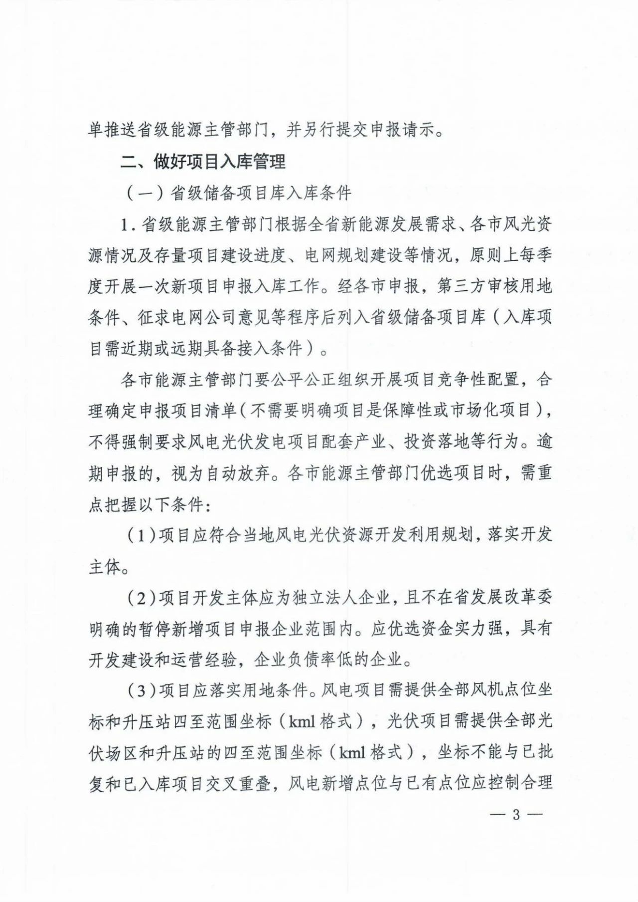 各市需公平開展項目競配,無需確定項目類型,但不得強制要求產業(yè)配套、投資落地等。項目應落實用地條件,風電項目需提供全部風機點位坐標和升壓站四至范圍坐標(kml格式),光伏項目需提供全部光伏場區(qū)和升壓站的四至范圍坐標(kml格式),坐標不能與已批復和已入庫項目交叉重疊。項目應承諾按要求配置儲能等調峰設施,入庫時不需要明確配置比例,出庫時按當年開發(fā)建設方案要求配置儲能。