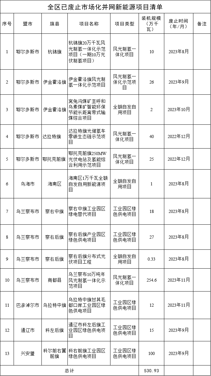 12月4日,內蒙古自治區(qū)能源局對各盟市已廢止的市場化并網新能源項目進行了公告,合計13個項目,涉及裝機規(guī)模超530萬千瓦,項目清單如下: