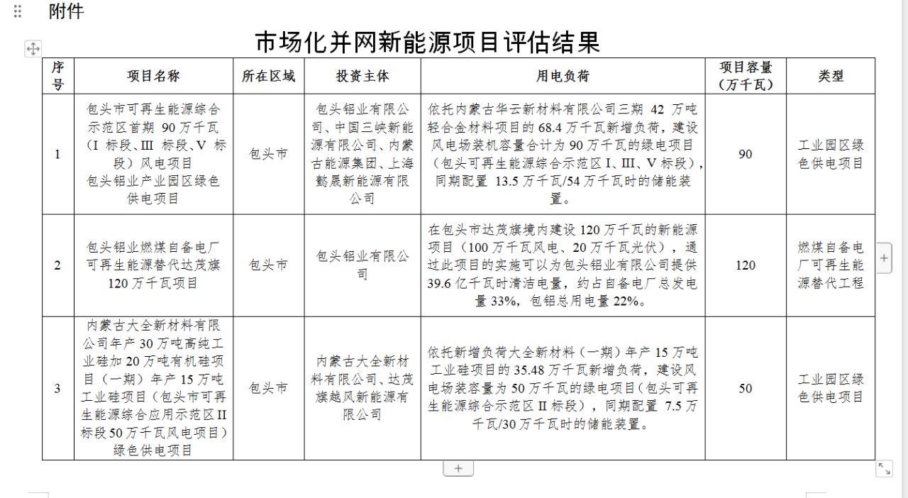 3個(gè)項(xiàng)目均納入市場(chǎng)化并網(wǎng)新能源項(xiàng)目清單,共配建新能源規(guī)模260萬(wàn)千瓦,其中風(fēng)電240萬(wàn)千瓦、光伏20萬(wàn)千瓦。分別是:包頭鋁業(yè)有限公司、中國(guó)三峽新能源有限公司、內(nèi)蒙古能源集團(tuán)、上海懿晟新能源有限公司聯(lián)合投資的包頭鋁業(yè)產(chǎn)業(yè)園區(qū)綠色供電項(xiàng)目,項(xiàng)目容量90萬(wàn)千瓦;2.包頭鋁業(yè)有限公司投資的包頭鋁業(yè)燃煤自備電廠可再生能源替代達(dá)茂旗120萬(wàn)千瓦項(xiàng)目;3.內(nèi)蒙古大全新材料有限公司、達(dá)茂旗越風(fēng)新能源有限公司聯(lián)合投資的“內(nèi)蒙古大全新材料有限公司年產(chǎn)30萬(wàn)噸高純工業(yè)硅加20萬(wàn)噸有機(jī)硅項(xiàng)目(一期)年產(chǎn)15萬(wàn)噸工業(yè)硅項(xiàng)目(包頭市可再生能源綜合應(yīng)用示范區(qū)II 標(biāo)段50萬(wàn)千瓦風(fēng)電項(xiàng)目)綠色供電項(xiàng)目”。