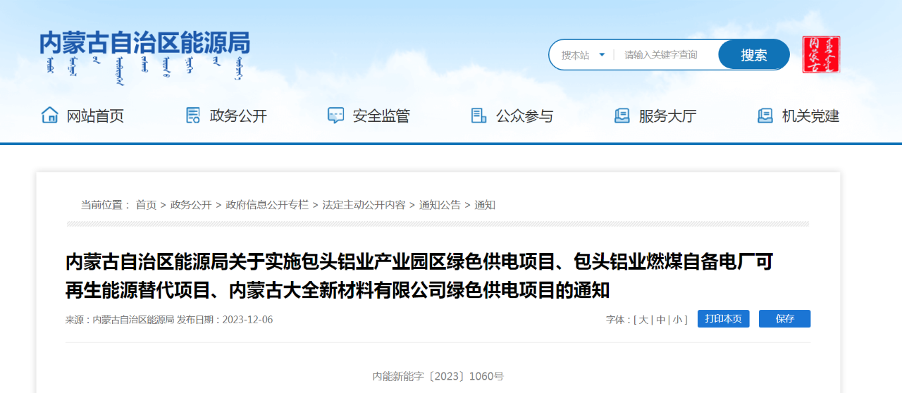 日前,內(nèi)蒙古自治區(qū)能源局網(wǎng)站發(fā)布“內(nèi)蒙古自治區(qū)能源局關(guān)于實(shí)施包頭鋁業(yè)產(chǎn)業(yè)園區(qū)綠色供電項(xiàng)目、包頭鋁業(yè)燃煤自備電廠可再生能源替代項(xiàng)目、內(nèi)蒙古大全新材料有限公司綠色供電項(xiàng)目的通知”(內(nèi)能新能字〔2023〕1060號(hào)),根據(jù)文件,自治區(qū)能源局組織評(píng)估單位和專(zhuān)家在《包頭市新能源新場(chǎng)景應(yīng)用方案》的基礎(chǔ)上,對(duì)包頭市申報(bào)的市場(chǎng)化新能源項(xiàng)目子方案進(jìn)行了評(píng)估。