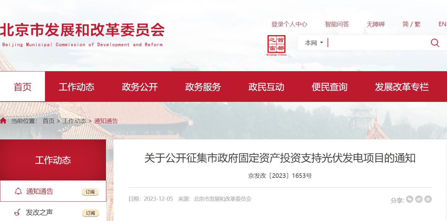 北京市發(fā)展和改革委員會關(guān)于公開征集市政府固定資產(chǎn)投資支持光伏發(fā)電項(xiàng)目的通知