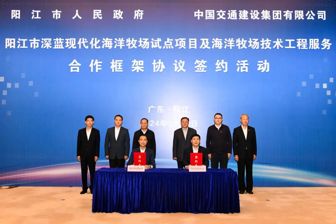 中交集團(tuán)黨委常委、副總經(jīng)理裴岷山與陽江市副市長關(guān)天表代表雙方簽署合作框架協(xié)議。根據(jù)協(xié)議,雙方將在海洋牧場試點項目及技術(shù)工程服務(wù)等方面開展務(wù)實合作。