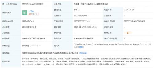 企查查顯示,4月17日,中電建(內(nèi)蒙古扎魯特)抽水蓄能有限公司成立,法定代表人為劉玉含,注冊(cè)資本3000萬(wàn)人民幣,經(jīng)營(yíng)范圍含風(fēng)力發(fā)電技術(shù)服務(wù)、太陽(yáng)能發(fā)電技術(shù)服務(wù)、新興能源技術(shù)研發(fā)、電力行業(yè)高效節(jié)能技術(shù)研發(fā)等。