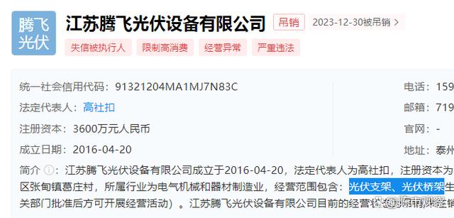 公開(kāi)資料顯示,江蘇騰飛光伏設(shè)備有限公司于2016年注冊(cè)成立,距今已有8年時(shí)間。騰飛光伏主營(yíng)業(yè)務(wù)為生產(chǎn)光伏組件,其中包括光伏支架、光伏橋架等產(chǎn)品的生產(chǎn)和銷售。有接近騰飛光伏的知情人士表示,騰飛光伏并非名不見(jiàn)經(jīng)傳的小工廠,而是曾位列全球出貨量前十的光伏組件工廠,2022年,騰飛光伏年產(chǎn)能高達(dá)20GW,生產(chǎn)的光伏組件熱銷歐洲、美洲、東南亞等。