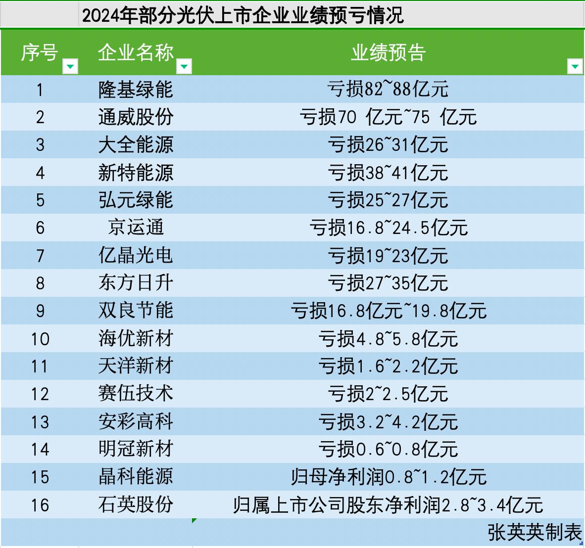 業(yè)績預(yù)告顯示,隆基綠能預(yù)計虧損82億到88億元,通威股份預(yù)計虧損70億至75億元,新特能源預(yù)計虧損38億至41億元,大全能源預(yù)計虧損26億至31億元,弘元綠能(603185.SH)預(yù)計虧損25億至27億元,東方日升預(yù)計虧損27億至35億元,億晶光電預(yù)計虧損19億至23億元,京運通(601908.SH)預(yù)計虧損16.8億至24.5億元,雙良節(jié)能(600481.SH)預(yù)計虧損16.8億至19.8億元。