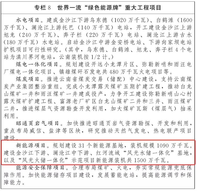 在具體項目方面,“十四五”期間,云南將規(guī)劃建設(shè)31個新能源基地,裝機(jī)規(guī)模為1090萬千瓦,建設(shè)金沙江下游、瀾滄江中下游、紅河流域“風(fēng)光水儲一體化”基地以及“風(fēng)光火儲一體化”示范項目新能源裝機(jī)共1500萬千瓦。