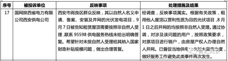 通報(bào)顯示:西安市閻良區(qū)群眾反映,其以自然人名義申請(qǐng)、備案、安裝及并網(wǎng)的光伏發(fā)電項(xiàng)目,9月7日被告知租賃屋頂需要按照非自然人受理,聯(lián)系95598供電服務(wù)熱線(xiàn)未給出明確答復(fù)。希望針對(duì)未按自然人受理給其納入國(guó)家財(cái)政補(bǔ)貼規(guī)模問(wèn)題,做出合理答復(fù)。