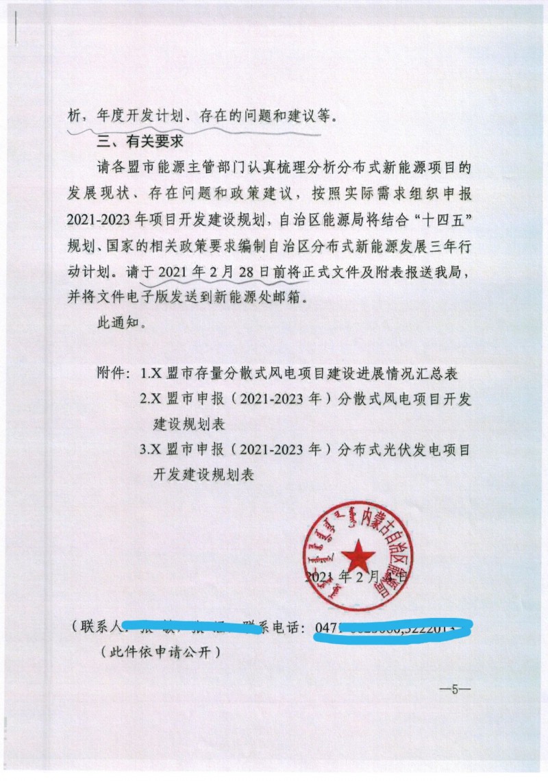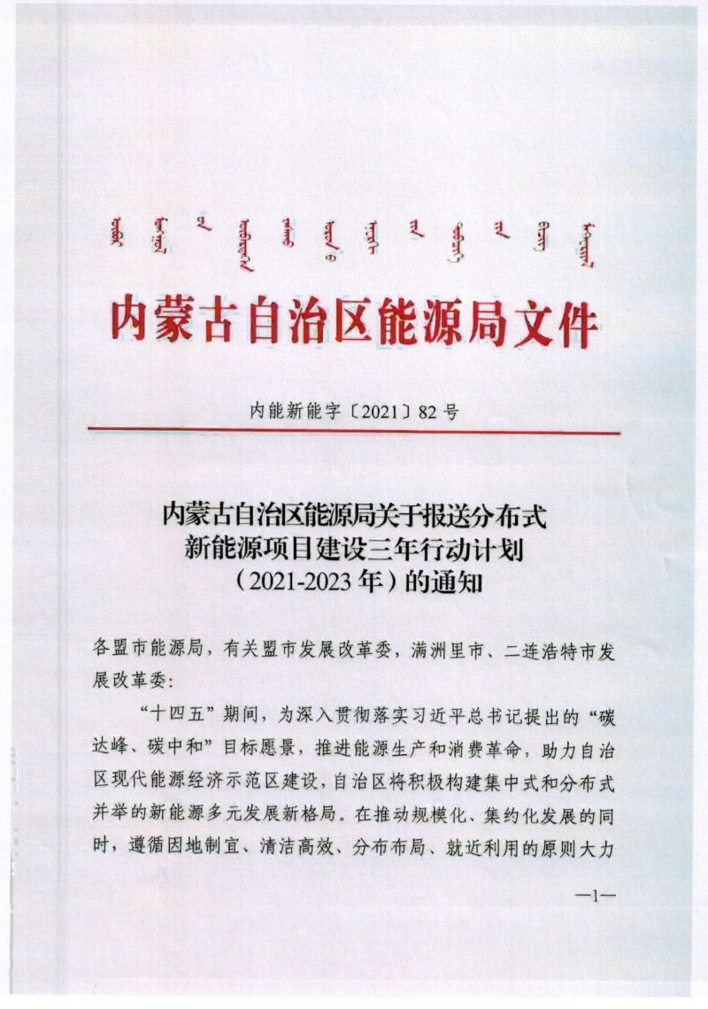近日,內(nèi)蒙古自治區(qū)能源局發(fā)布關(guān)于報送《分布式新能源項(xiàng)目建設(shè)三年行動計劃(2021-2023年)》的通知。