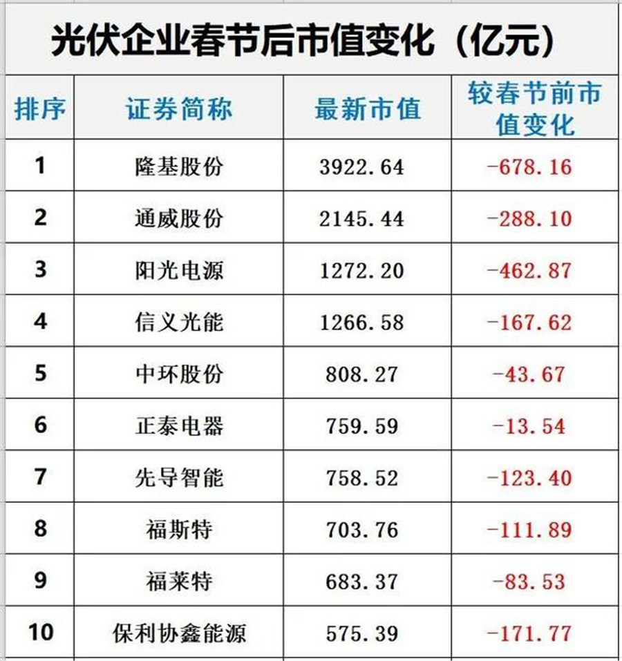 其中隆基股份總市值較春節(jié)前下跌678億、通威股份下跌288億、陽光電源跌去462億、信義光能下跌167億、中環(huán)股份下跌43億、正泰電器跌去13億、先導(dǎo)智能跌去123億、福斯特跌去111億、福萊特跌去83億、保利協(xié)鑫能源跌去171億、晶澳科技跌去97億。