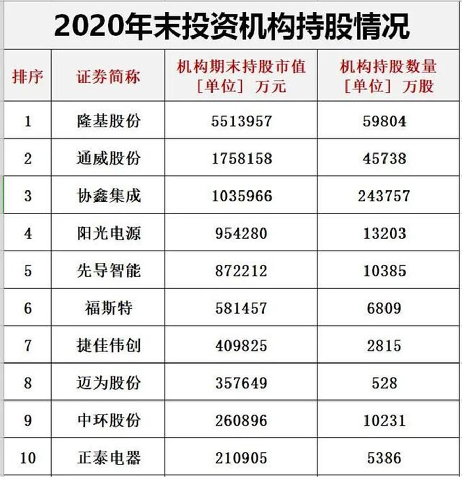 但近期黑鷹光伏團(tuán)隊做了另一維度相關(guān)統(tǒng)計分析,結(jié)果與光伏產(chǎn)業(yè)層面一片欣欣向榮的大趨勢并不完全“呼應(yīng)”。我們發(fā)現(xiàn):2020年第四季度,機(jī)構(gòu)投資者巨額減持光伏概念股,具體而言,第四季度末較第三季度末投資機(jī)構(gòu)持股倉位減少了1727350萬股!(后附2020年末投資機(jī)構(gòu)持股光伏排行榜)。