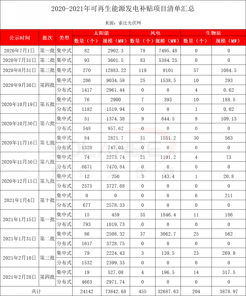 據(jù)索比光伏網(wǎng)統(tǒng)計(jì),2020年至今,國(guó)家電網(wǎng)共公布十四批可再生能源補(bǔ)貼清單。其中,太陽(yáng)能發(fā)電項(xiàng)目24142個(gè),容量73.84GW;風(fēng)電項(xiàng)目455個(gè),容量32.69GW;生物質(zhì)發(fā)電項(xiàng)目204個(gè),容量3.88GW。