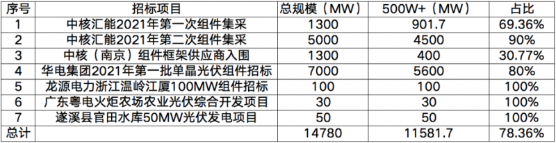 近日以來(lái),以中核、華電為代表的央國(guó)企已經(jīng)開(kāi)啟或完成2021年第一批次的光伏組件設(shè)備招標(biāo)工作,根據(jù)招標(biāo)要求發(fā)現(xiàn),大尺寸組件的需求已進(jìn)入白熱化階段。