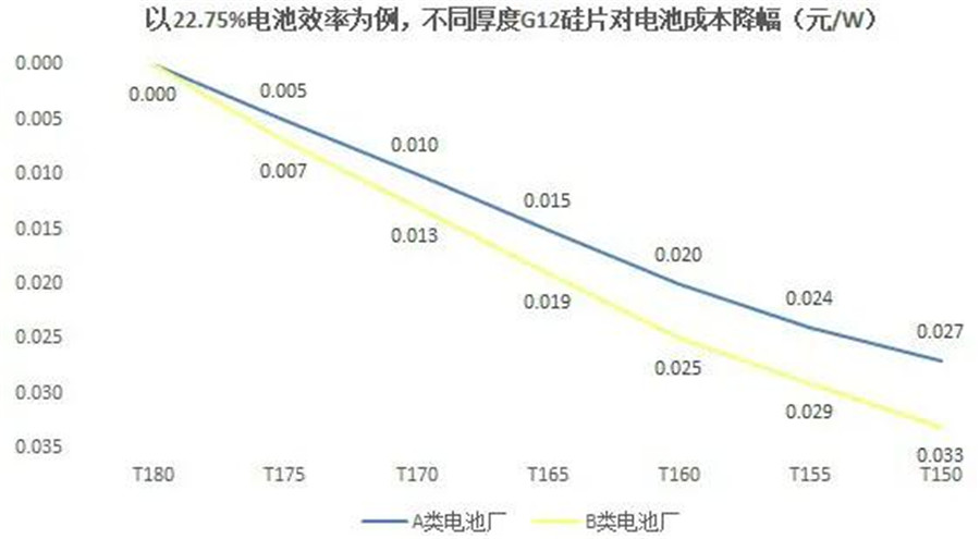 在成本核算上,依據(jù)上述效率測(cè)算條件,應(yīng)用160μm硅片的電池,每片成本降幅為0.025元/W。