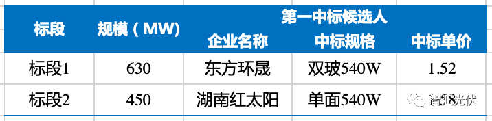 根據(jù)索比光伏網(wǎng)統(tǒng)計(jì),廣州發(fā)展集采標(biāo)段一中標(biāo)候選人第一名為環(huán)晟光伏,投標(biāo)單價(jià)1.52元/W,且為最低投標(biāo)單價(jià),組件投標(biāo)規(guī)格為雙玻540W;標(biāo)段二中標(biāo)候選人第一名為湖南紅太陽,投標(biāo)單價(jià)1.58元/W,組件投標(biāo)規(guī)格為單面540W。詳情請(qǐng)見下表: