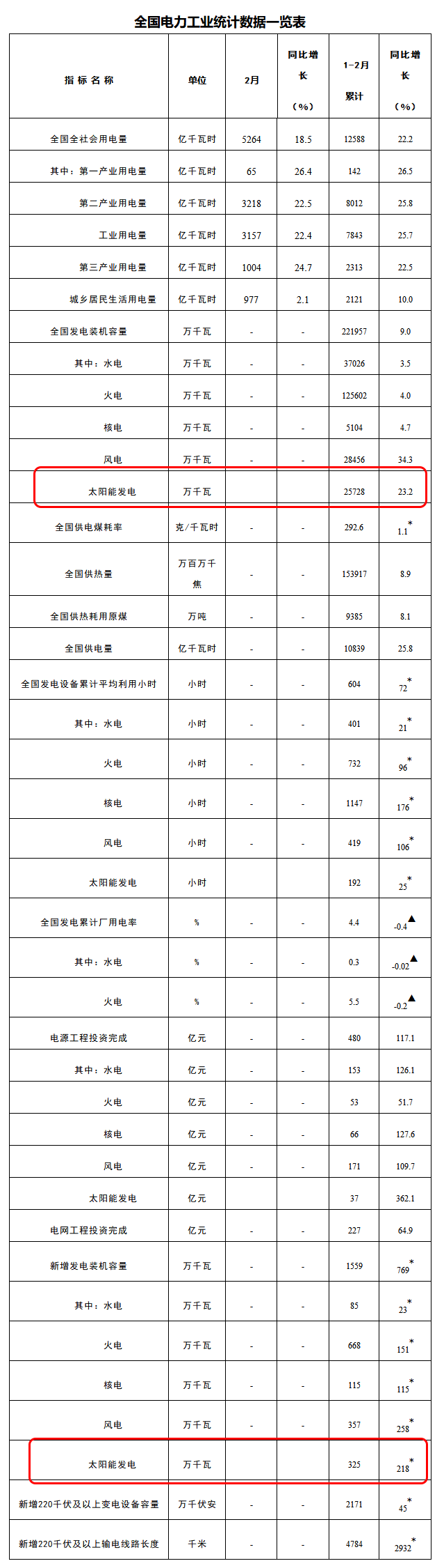 今年1-2月份,全國全社會用電量為12588億千瓦時(shí),同比增長22.2%。全國發(fā)電裝機(jī)容量為221957萬千瓦,同比上漲9%;其中太陽能發(fā)電裝機(jī)容量25728萬千瓦,同比增長23.2%。