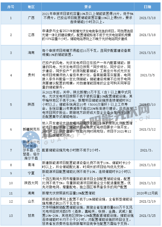 就消納掣肘,光伏電站配置儲(chǔ)能成為政策導(dǎo)向。據(jù)北極星太陽(yáng)能光伏網(wǎng)統(tǒng)計(jì),2021開(kāi)年以來(lái),廣西、江西、貴州、山東、海南等13個(gè)地區(qū)要求風(fēng)、光項(xiàng)目強(qiáng)配儲(chǔ)能,比例在5%~10%之間,連續(xù)儲(chǔ)能在2小時(shí)及以上。然而在儲(chǔ)能經(jīng)濟(jì)性仍未達(dá)到預(yù)期且獲利商業(yè)模式仍未明朗下,強(qiáng)配儲(chǔ)能對(duì)于光伏電站投資業(yè)主來(lái)說(shuō)無(wú)疑是雪上加霜。