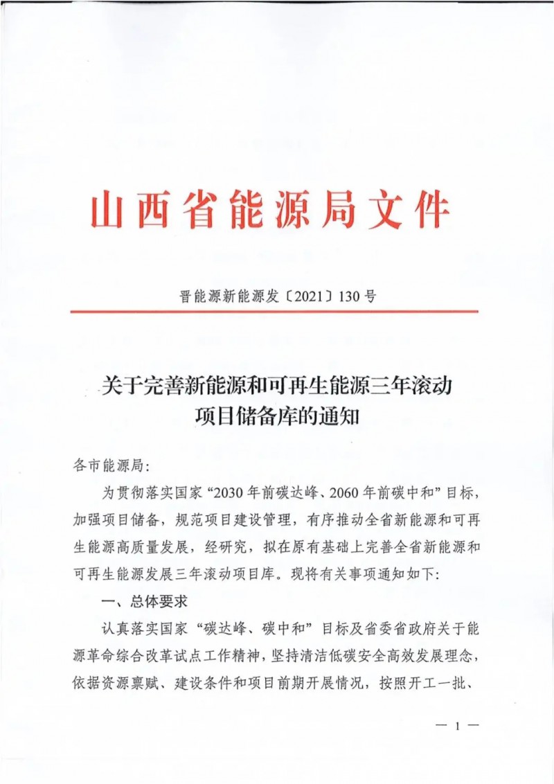 3月26日,山西省能源局印發(fā)《關(guān)于完善新能源和可再生能源三年滾動項目儲備庫的通知》,就項目規(guī)劃、管理、建設(shè)方面作出相關(guān)指示。