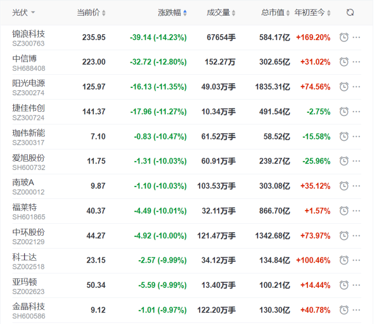 作為資本市場重要板塊,光伏行業(yè)很難置身事外,超80%光伏概念股今日出現(xiàn)下跌,電氣設(shè)備板塊整體跌幅5.79%。具體看,愛旭股份、南玻A、福萊特、中環(huán)股份、科士達(dá)、亞瑪頓、金晶科技等7只股票跌停,錦浪科技、中信博、陽光電源、捷佳偉創(chuàng)、珈偉新能等5只身處創(chuàng)業(yè)板、科創(chuàng)板的股票跌幅超過10%,超30只股票跌幅超過5%,就連光伏ETF(SH:515790)也罕見地出現(xiàn)6.98%下跌。