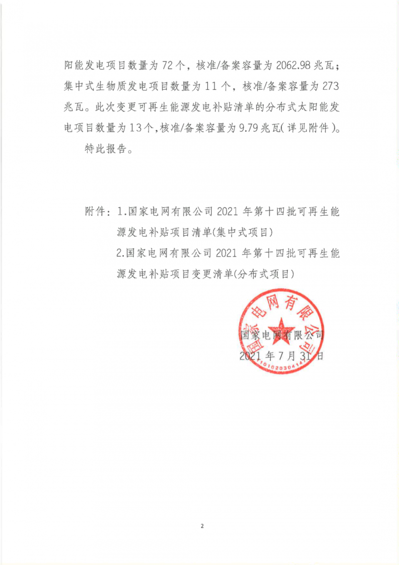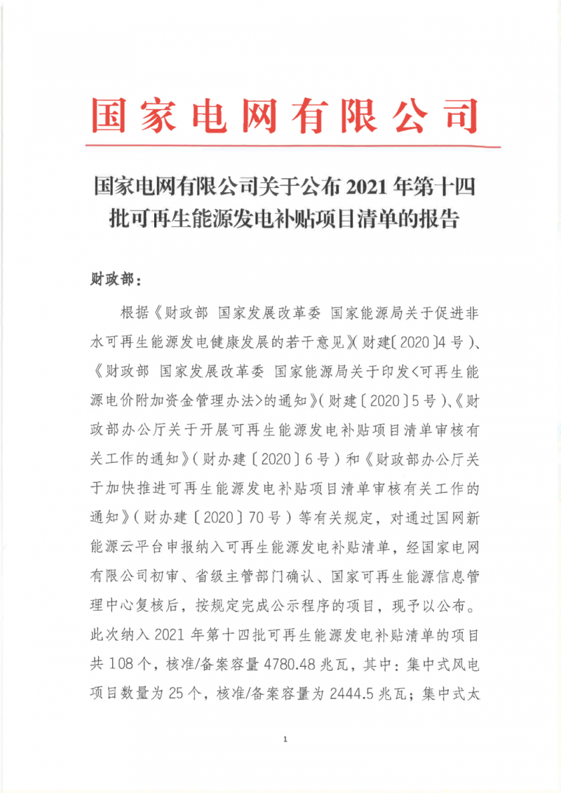 關(guān)于公布2021年第十四批可再生能源發(fā)電