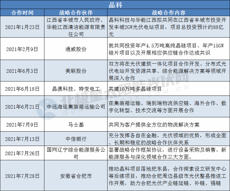 據(jù)北極星太陽(yáng)能光伏網(wǎng)不完全統(tǒng)計(jì),2021年初至今,已有晶科、通威、晶澳、特變電工、天合光能5家光伏企業(yè)在通過(guò)增資入股、合資擴(kuò)產(chǎn)形式成為深度戰(zhàn)略合作伙伴。