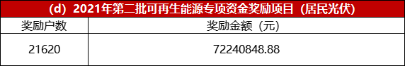 而2021年第二批光伏專項資金獎勵項目共計22894個,獎勵金額2.68億。其中光伏電站項目13個,獎勵金額3531千萬;企業(yè)光伏項目1261個,獎勵金額1.605億;居民光伏21620戶,獎勵金額7224千萬。