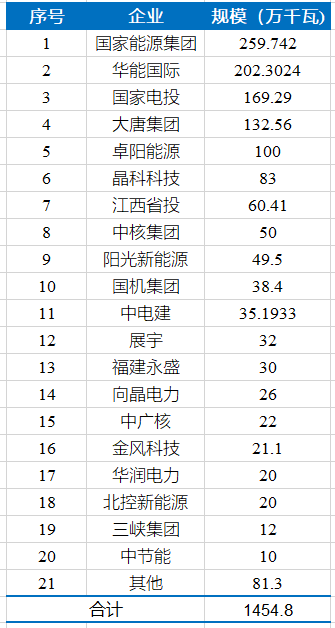 從投資企業(yè)來看,國家能源集團及參股的項目的規(guī)模最大,約為2.6GW;華能及參股的項目的規(guī)模也超過2GW;國家電投、大唐、卓陽能源均獲得1GW及以上規(guī)模。具體如下表所示。