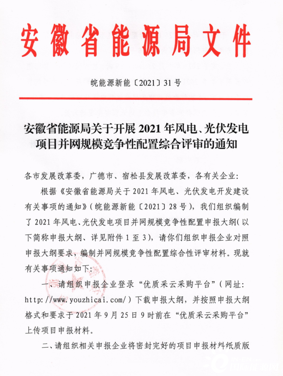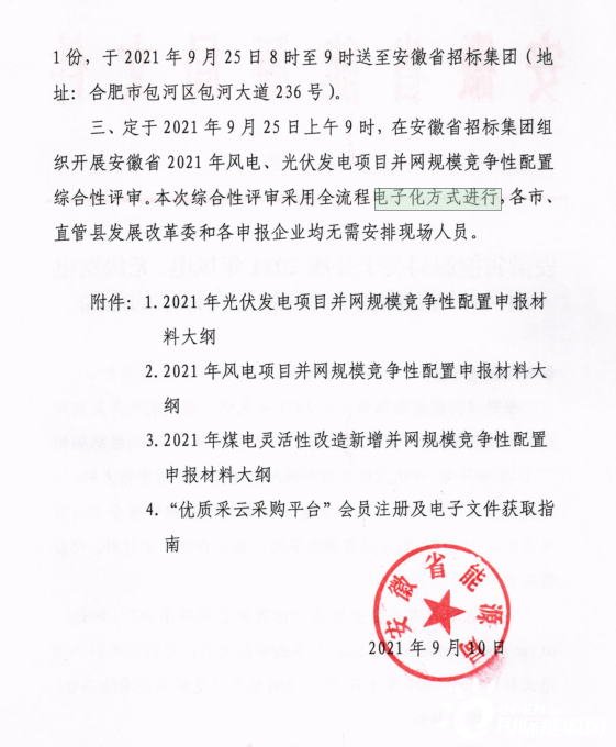 9月25日,安徽省招標集團將組織開展安徽省2021年風(fēng)電、光伏發(fā)電項目并網(wǎng)規(guī)模競爭性配置綜合性評審。評審工作全程采用電子化方式進行,申報人員無需現(xiàn)場參與。