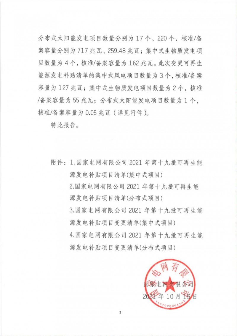 2021年10月15日,我公司已將完成公示的2021年第十九批可再生能源發(fā)電項目補(bǔ)貼項目清單上報國家主管部門,第十九批項目清單及后續(xù)項目審核進(jìn)展情況,請登錄新能源云平臺查詢。