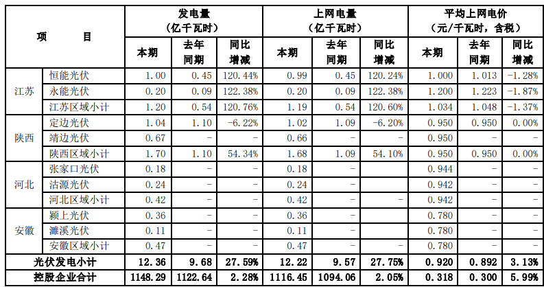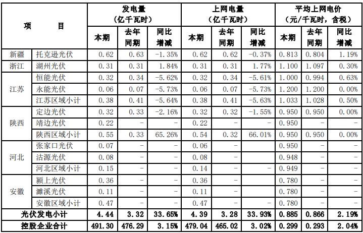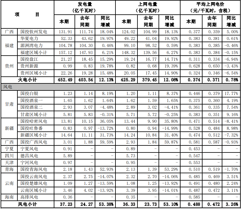 根據國投電力控股股份有限公司(以下簡稱公司)境內控股企業(yè)初步統(tǒng)計, 2021年 7-9 月,公司境內控股企業(yè)累計完成發(fā)電量491.30 億千瓦時,上網電量479.04 億千瓦時,與去年同期相比分別增加3.15%和3.02%。2021年1-9月,公司境內控股企業(yè)累計完成發(fā)電量1148.29億千瓦時,上網電量1116.45億千瓦時, 與去年同期相比分別增加 2.28%和2.05%。 2021年7-9 月,公司境內控股企業(yè)平均上網電價0.299 元/千瓦時,與去年同期相比增加了 2.04%。