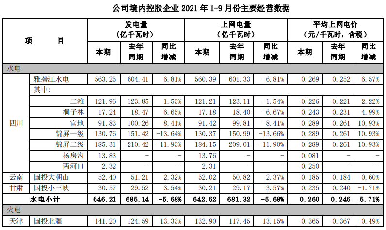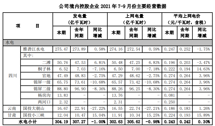 2021年1-9月,公司境內控股企業(yè)平均上網電價 0.318元/ 千瓦時,與去年同期相比增加了5.99%。