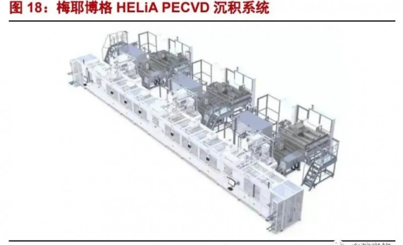 2)PECVD(非晶硅薄膜沉積):該步驟取代了傳統(tǒng)PERC工藝中的擴(kuò)散工藝,是構(gòu)造異質(zhì)結(jié)結(jié)構(gòu)的關(guān)鍵,難度、壁壘最高,價(jià)值占到全部設(shè)備的50%,為異質(zhì)結(jié)設(shè)備的核心。從技術(shù)路徑上:板式PECVD是目前主流,管式PECVD、Cat-CVD具潛力。國(guó)外廠商包括:梅耶博格(已不對(duì)外提供)、應(yīng)用材料等。國(guó)內(nèi)廠商包括:邁為股份、金辰股份、捷佳偉創(chuàng)、理想能源、鈞石能源等。