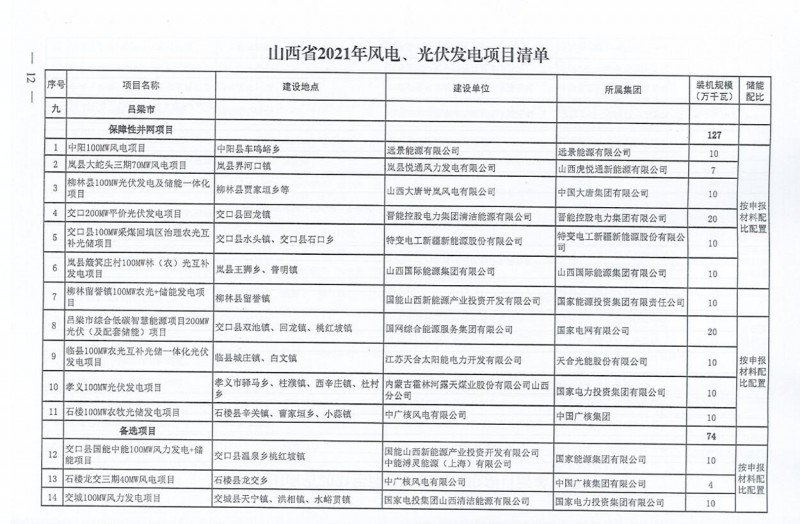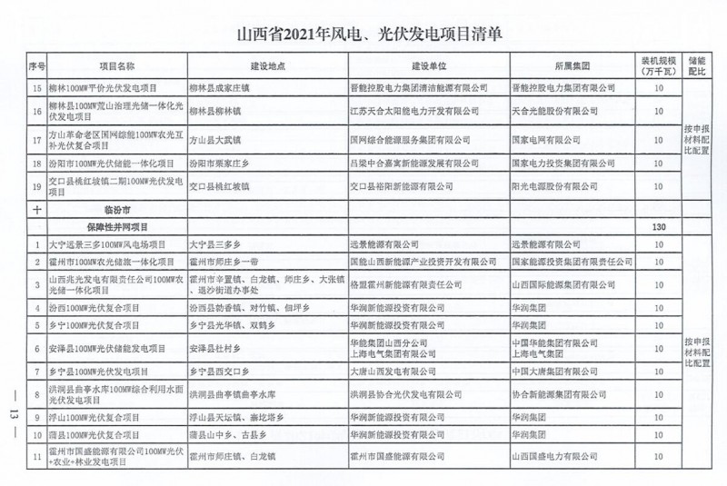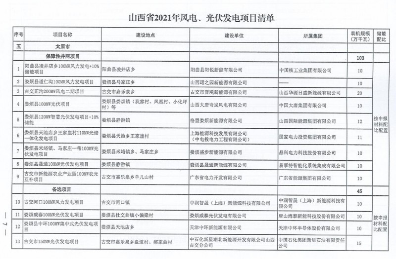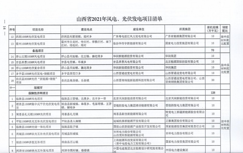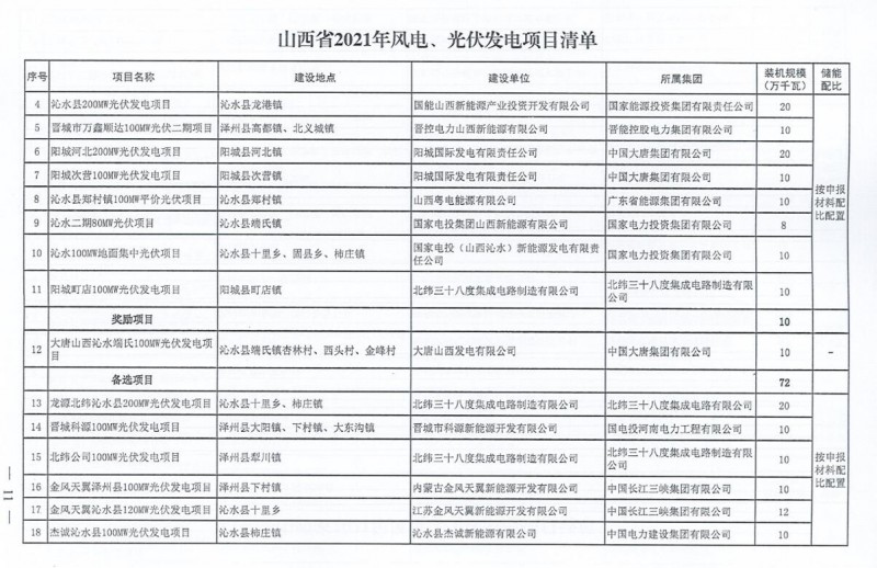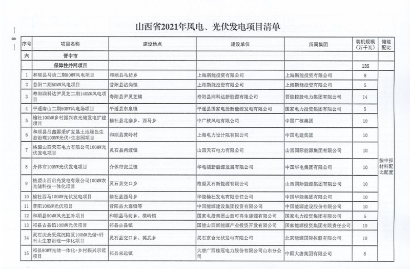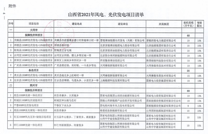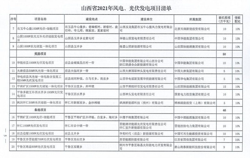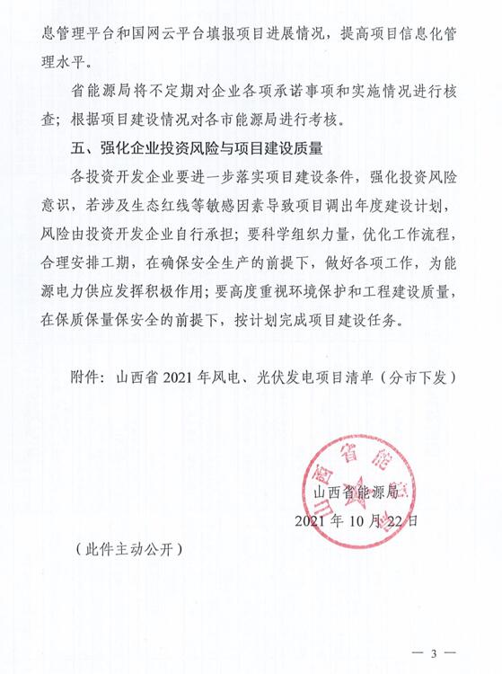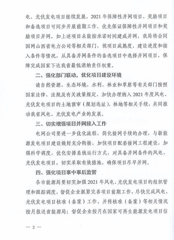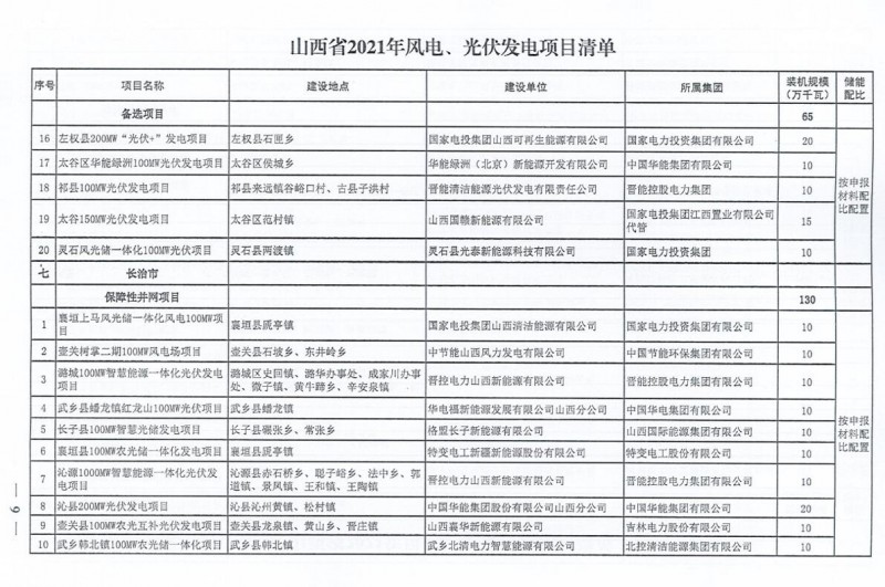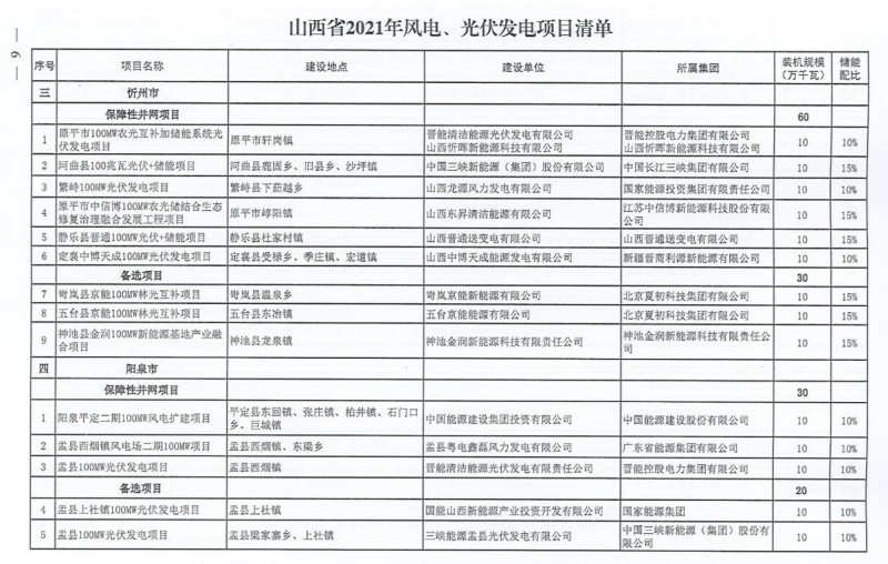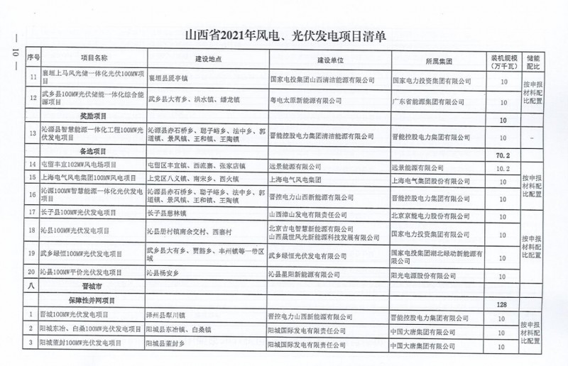 10月22日,山西省能源局下達(dá)2021年度風(fēng)電、光伏發(fā)電保障性并網(wǎng)年度建設(shè)計(jì)劃。風(fēng)、光合計(jì)17.792GW,其中保障性11.2GW+獎(jiǎng)勵(lì)700MW+備選5.892GW。文件明確保障性規(guī)模與獎(jiǎng)勵(lì)規(guī)??赏介_展前期工作,優(yōu)先保證保障性并網(wǎng)項(xiàng)目和獎(jiǎng)勵(lì)項(xiàng)目并網(wǎng),如上述項(xiàng)目未能按承諾時(shí)間并網(wǎng),將視項(xiàng)目成熟度、建設(shè)進(jìn)度和接入條件等,從備選項(xiàng)目中選擇并網(wǎng)項(xiàng)目,保障完成國(guó)家下達(dá)的最低消納責(zé)任權(quán)重。
