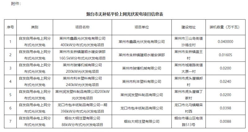 附件:煙臺市無補貼平價上網(wǎng)光伏發(fā)電項目信息表
