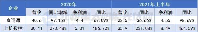 以鑄錠爐起家的京運通從2017年開始主攻硅片業(yè)務(wù),截至2021年中,京運通單晶硅片產(chǎn)能約8GW,另有12GW新增產(chǎn)能處于爬產(chǎn)期,預(yù)計2021年底產(chǎn)能達(dá)20GW;切割設(shè)備商上機(jī)數(shù)控從2019 年通過全資子公司弘元新材進(jìn)一步拓展單晶硅業(yè)務(wù),截至2021年中,實際產(chǎn)能20GW。2020年以及2021年上半年,京運通、上機(jī)數(shù)控營收及凈利潤均實現(xiàn)了大幅增長,最高漲幅達(dá)464.59%,主要原因均指向硅片營收的大增。其中,上機(jī)數(shù)控2021年上半年營收及凈利潤均超過2020年全年。