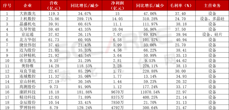 19家設備企業(yè)中,大族激光凈利潤最高,前三季度實現(xiàn)營收119.3億元,同比增長34.67%,實現(xiàn)凈利潤15億元,同比增長47.06%。光伏方面,公司Q1-3光伏行業(yè)專用設備實現(xiàn)營業(yè)收入8724.03萬,同比增長42.80%,劃裂機、開膜摻雜機等設備形成批量銷售。