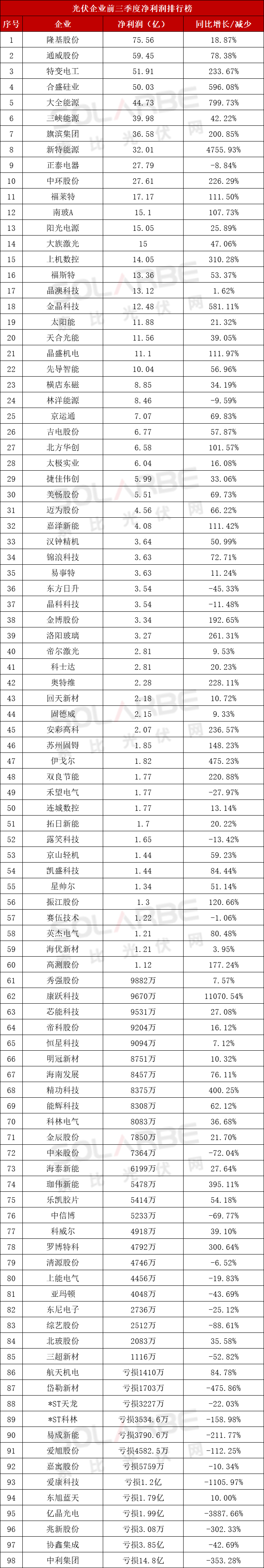 光伏企業(yè)前三季度凈利潤同增排行榜