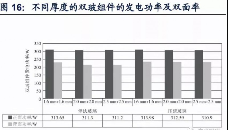 超白浮法玻璃力學(xué)性能更優(yōu),薄化后作為背板的發(fā)電功率接近超白壓延玻璃,陸續(xù)出現(xiàn)組件廠(chǎng)商采用超白浮法玻璃作為背板以降低成本。浮法玻璃表面平整度高,抗沖擊強(qiáng)度較壓延玻璃更為出色,并且隨著厚度降低,二者抗沖擊強(qiáng)度相差拉大,在1.6 mm浮法玻璃平均破碎高度高出超白壓延玻璃達(dá)97.77%。另外,雖然浮法玻璃透過(guò)率不如超白壓延玻璃,作為雙玻組件背板后會(huì)導(dǎo)致背面發(fā)電功率降低,但隨著厚度減小,二者發(fā)電功率差距逐漸降低,1.6mm雙玻組件下的背面發(fā)電功率相差僅為5.45W。浮法玻璃作為組件背板使用時(shí),雙玻組件正面發(fā)電功率也可達(dá)到壓延玻璃作為背板時(shí)的發(fā)電功率。因此陸續(xù)有組件公司為降低生產(chǎn)成本,使用浮法玻璃作為背板。