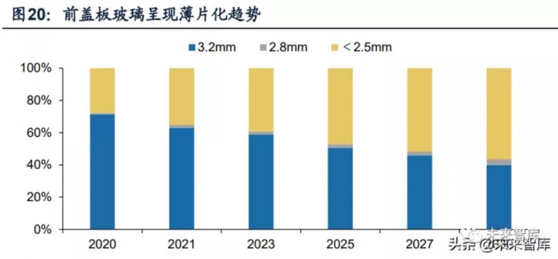超薄光伏玻璃減少原片使用,助力降本同時(shí)順應(yīng)雙面組件輕量化需求,有望成為雙玻組件主流產(chǎn)品。超薄光伏玻璃節(jié)省原片使用量,價(jià)格相對(duì)傳統(tǒng)光伏玻璃更低,市場(chǎng)份額將伴隨雙玻組件滲透逐年提升。根據(jù)CPIA統(tǒng)計(jì),2020年2.5mm及以下厚度的前蓋板玻璃市占率約為29%,2025/2030年有望提升至47%/56%。