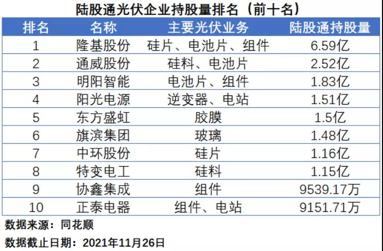 在陸股通持股量排名中,截止到11月26日收盤(下同),隆基股份憑借自身超強(qiáng)的綜合實(shí)力以及較高的總股本規(guī)模最受“北向資金”的青睞,以6.59億的持股量位居第一,通威股份和明陽(yáng)智能分別以2.52億和1.83億位居第二和第三。陽(yáng)光電源、東方盛虹、旗濱集團(tuán)、中環(huán)股份、特變電工的持股量均在1億股以上。在前十名中,共有4家企業(yè)涉足組件業(yè)務(wù),3家企業(yè)涉足電池片業(yè)務(wù),涉足硅料、硅片業(yè)務(wù)的企業(yè)各有2家。