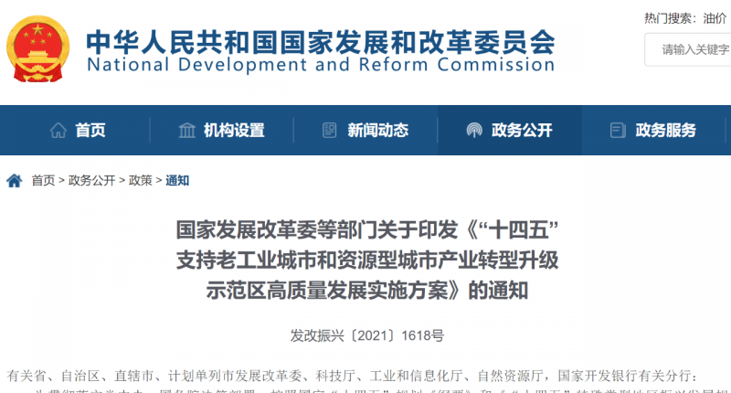 國家發(fā)展改革委等部門關(guān)于印發(fā)《“十四五”支持老工業(yè)城市和資源型城市產(chǎn)業(yè)轉(zhuǎn)型升級(jí)示范區(qū)高質(zhì)量發(fā)展實(shí)施方案》的通知