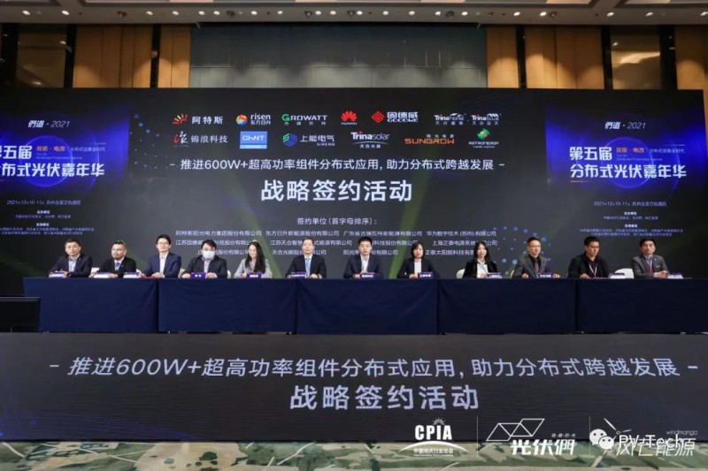 為了進(jìn)一步推動分布式場景的光伏發(fā)展,12月10日,全球領(lǐng)先光伏組件企業(yè)阿特斯、東方日升、天合光能攜天合智慧分布式、正泰太陽能,以及7家主流逆變器廠商固德威、古瑞瓦特、華為、錦浪科技、上能電氣、陽光電源和正泰電源(按首字母排序),共同舉行了戰(zhàn)略簽約儀式,聯(lián)合聲明共同推進(jìn)600W+超高功率組件分布式應(yīng)用,構(gòu)建600W+分布式應(yīng)用體系,推動分布式產(chǎn)業(yè)結(jié)構(gòu)高端化、分布式能源消費低碳化轉(zhuǎn)型。