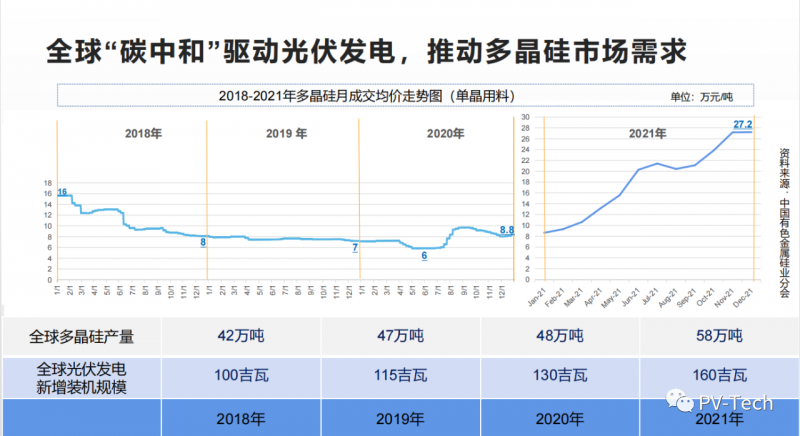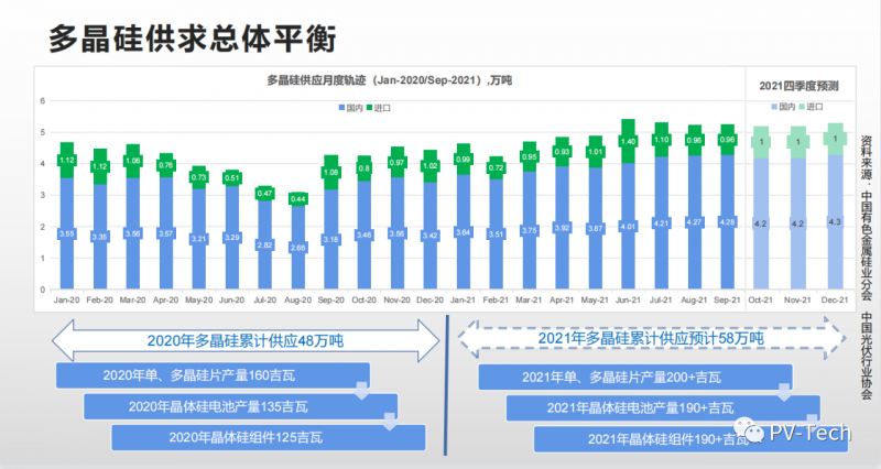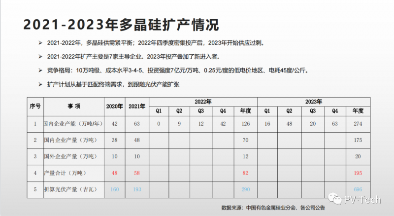 呂錦標在報告里也公布了全球7家主要企業(yè)和4家新進入企業(yè)的擴產(chǎn)情況,預(yù)測2022年多晶硅供應(yīng)可以超過80萬噸,比今年增加20萬噸。主要產(chǎn)能集中在下半年投產(chǎn)。對應(yīng)明年200吉瓦的裝機預(yù)測,多晶硅供應(yīng)大于需求。有望推動價格下行。