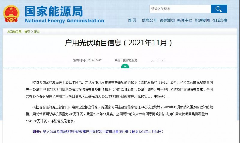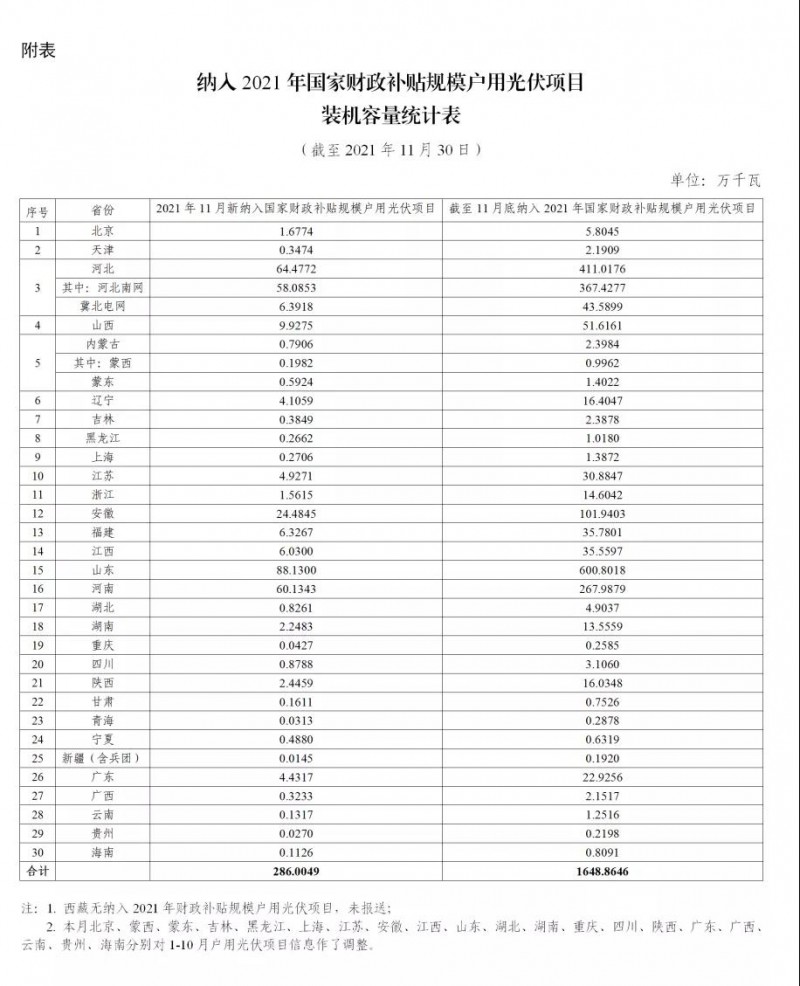 根據(jù)各省級能源主管部門、電網(wǎng)企業(yè)報送信息,經(jīng)國家可再生能源信息管理中心梳理統(tǒng)計,2021年11月新納入國家財政補貼規(guī)模戶用光伏項目總裝機容量為286萬千瓦。截至2021年11月底,全國累計納入2021年國家財政補貼規(guī)模戶用光伏項目裝機容量為1648.86萬千瓦。詳細(xì)情況見附表。