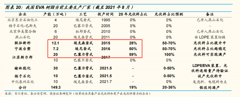 縱觀所有具備EVA產(chǎn)能的國內(nèi)企業(yè),能夠生產(chǎn)光伏級EVA的也只有斯爾邦、聯(lián)泓新科和寧波臺塑三家。榆林能化、揚子石化、中化泉州石化均在2021年5-7月投產(chǎn)EVA材料,但暫未具備生產(chǎn)光伏級EVA的能力。