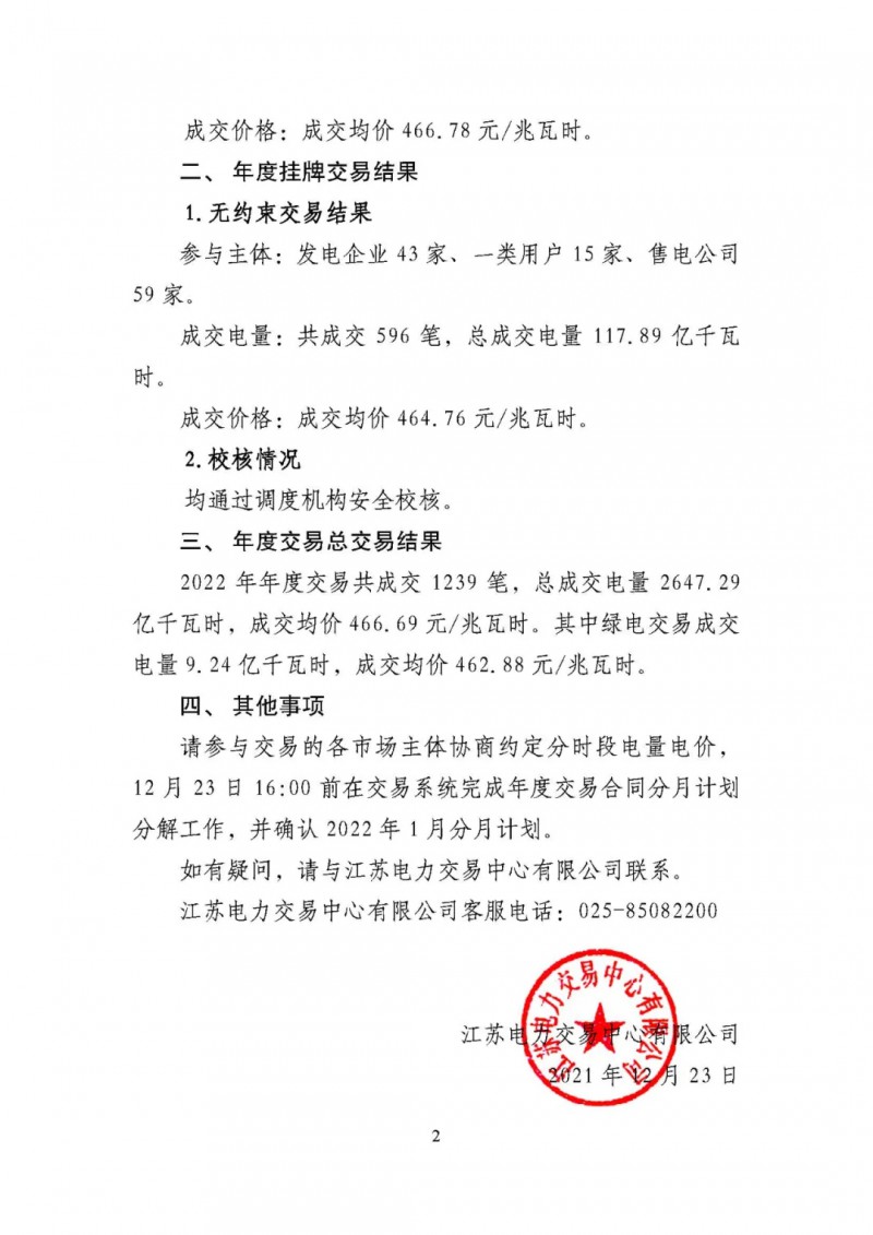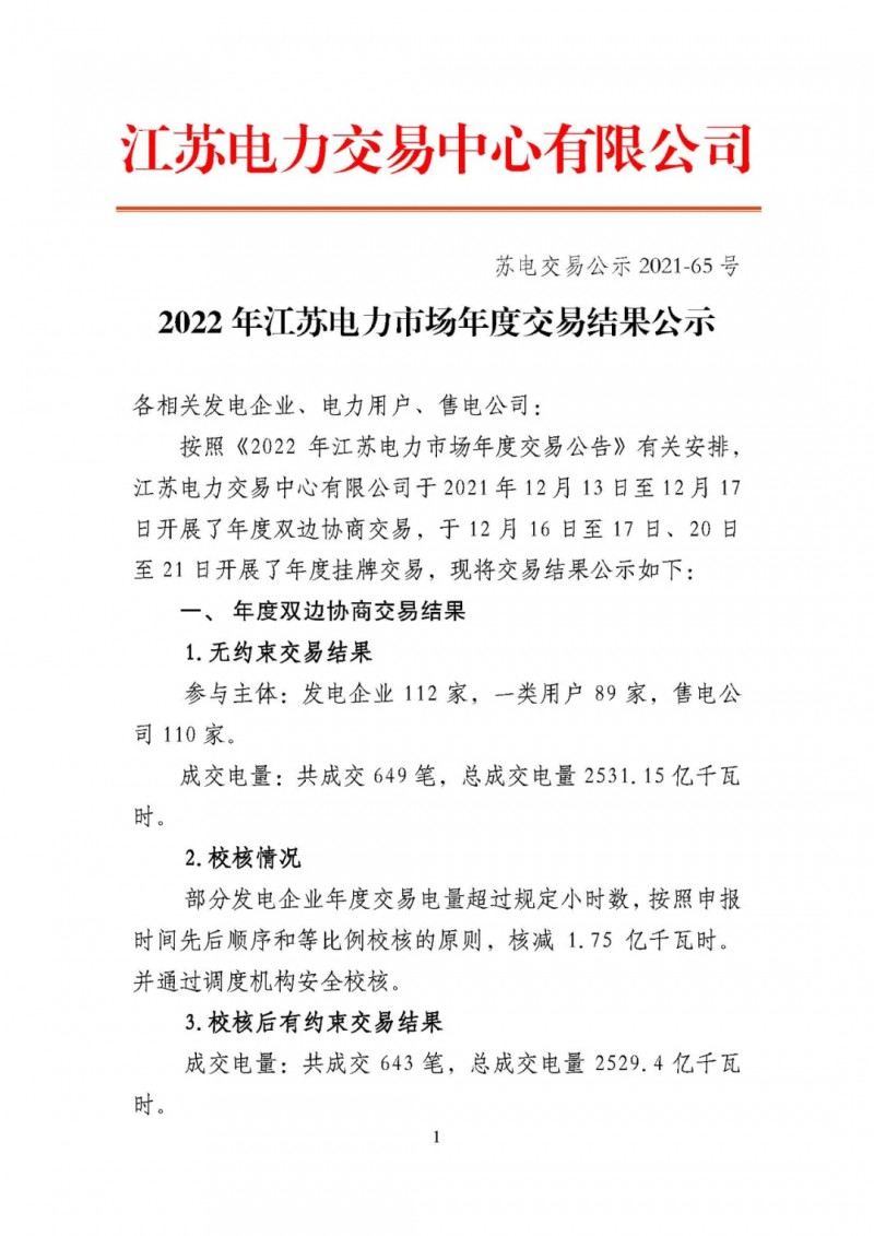 12月23日,江蘇電力交易中心有限公司發(fā)布了2022年江蘇電力市場(chǎng)年度交易結(jié)果。江蘇電力交易中心有限公司于2021年12月13日至12月17日開(kāi)展了年度雙邊協(xié)商交易,于12月16日至17日、20日至21日開(kāi)展了年度掛牌交易。
