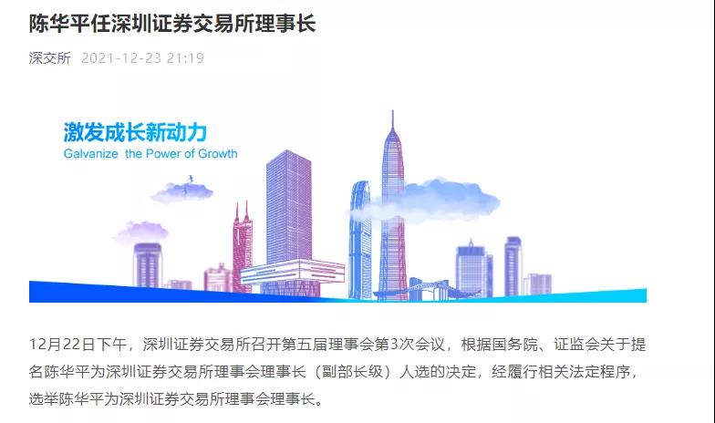 深交所消息,12月22日下午,深圳證券交易所召開第五屆理事會(huì)第3次會(huì)議,根據(jù)國務(wù)院、證監(jiān)會(huì)關(guān)于提名陳華平為深圳證券交易所理事會(huì)理事長(副部長級(jí))人選的決定,經(jīng)履行相關(guān)法定程序,選舉陳華平為深圳證券交易所理事會(huì)理事長。