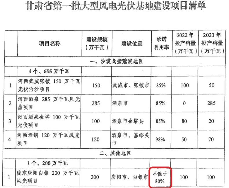 在國家能源局、國家發(fā)改委印發(fā)的《第一批以沙漠、戈壁、荒漠地區(qū)為重點的大型風電、光伏基地建設項目清單的通知》中,青海省僅僅給出了84%的利用率承諾;而甘肅的一個基地,甚至只敢承諾80%!