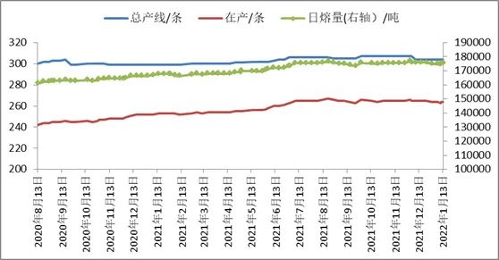 供應(yīng)方面,截至1月13日,全國(guó)浮法玻璃生產(chǎn)線共計(jì)304條,在產(chǎn)264條,日熔量共計(jì)175225噸,環(huán)比前一周增加400噸/日。周內(nèi)生產(chǎn)線點(diǎn)火1條,冷修1條,改產(chǎn)1條。漳州旗濱玻璃有限公司800噸/日四線冷修完成,1月11日點(diǎn)火復(fù)產(chǎn)。重慶市賽德化工有限公司400噸/日一線窯爐到期,1月10日放水冷修。滕州金晶玻璃有限公司800噸/日四線原產(chǎn)白玻,1月10日投料改產(chǎn)超白。后期湖北明弘700噸/日生產(chǎn)線計(jì)劃20日冷修;本溪玉晶一條800噸/日生產(chǎn)線計(jì)劃復(fù)產(chǎn),一條700噸/日生產(chǎn)線計(jì)劃停產(chǎn)。光伏玻璃方面,深圳南玻一條600噸/日計(jì)劃本月末前冷修放水,福萊特一條600噸/日生產(chǎn)線計(jì)劃點(diǎn)火。玻璃生產(chǎn)利潤(rùn)尚可,玻璃企業(yè)冷修計(jì)劃或有所延后。